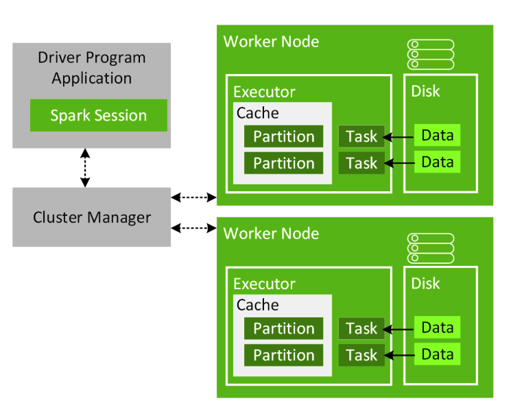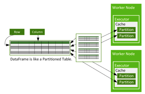 cache된 데이터는 데이터프레임이 각 워커노드에 파티션 단위로 분산되어 존재하듯 파티션 단위로 캐시공간에 로드되며 executor 내부, task 바깥에 존재한다. 이때 데이터가 executor의 storage 메모리에 들어가기 충분하지 않으면 disk 공간이 추가로 사용될 수 있다.