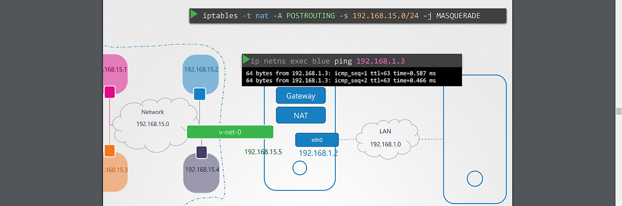 2.NAT 규칙을 생성하여, blue 네임스페이스에서 나간 패킷이 공인 호스트 ip 주소를 가지게끔하여, 외부에서 응답이 돌아올 때 제대로 호스트를 통해 blue 네임스페이스까지 돌아올 수 있도록 한다.